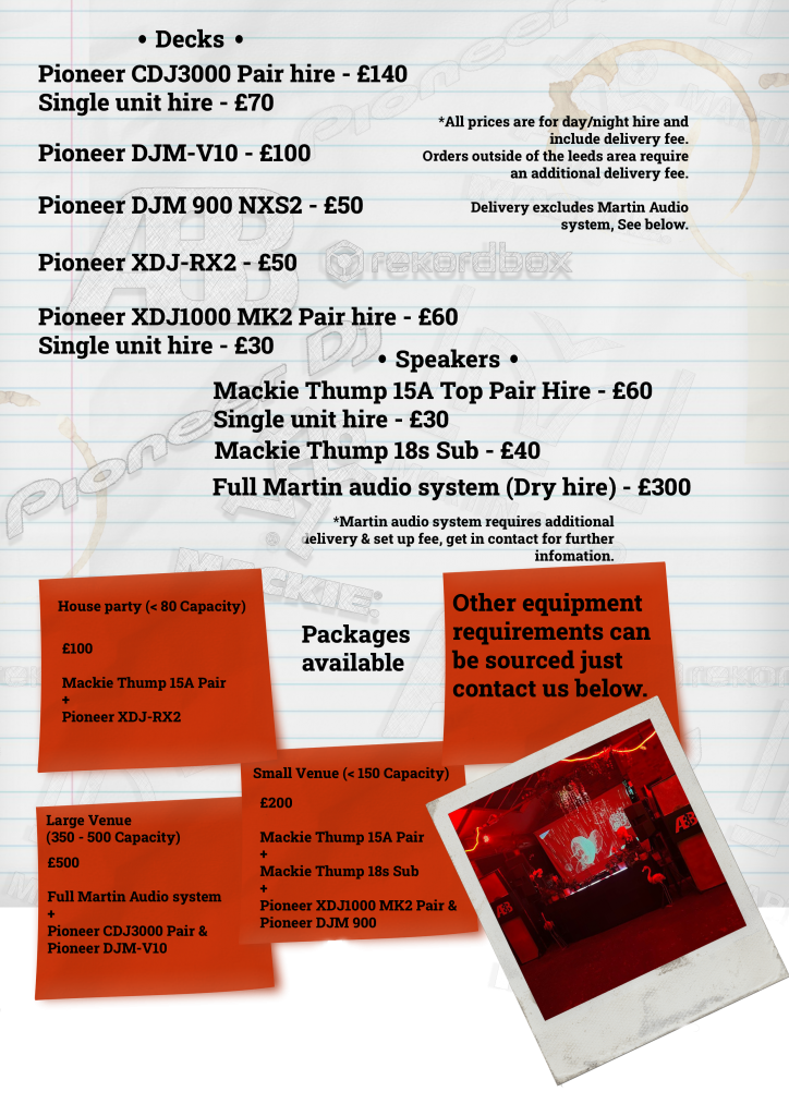 We now have a collection of official Pioneer/ Martin Audio/ Mackie DJ equipment and sound systems that are available for commercial and private hire. From Festival to Venue to House Party we’ve got you covered. For the full price list and specs please see below
